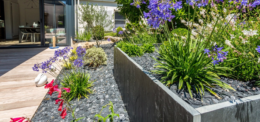 En murets de soutènement : la palis d’ardoise aux bords sciés retient la terre et remplace les murs de parpaings ou plaque de béton.
