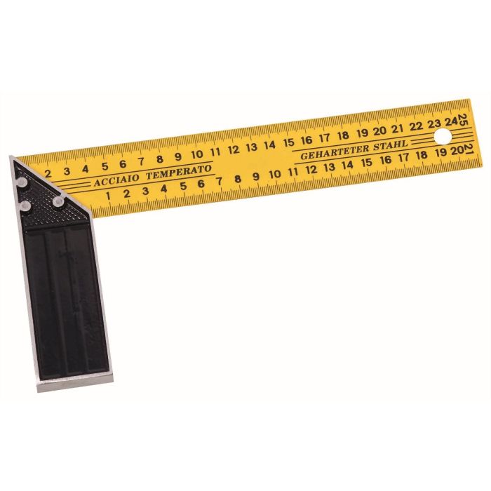 Équerre de mesure en acier trempé, graduée des deux côtés, avec talon en plastique.