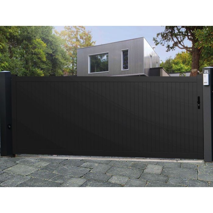 Le portail aluminium Panama se distingue par un remplissage plein aux fines lames verticales. Ce qui offre une occultation optimale pour les personnes recherchant une grande intimité.